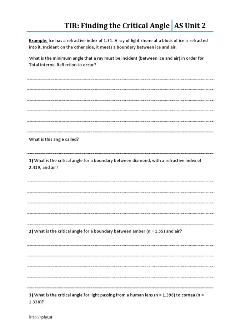 Encyclopedia britannica , 4 feb. Critical angle explained using a ray diagram. Redraw the complete diagram showing the angles at o with their values. Is there a formula or a way to derive some equations? If the angle of incidence were exactly critical, then the angle of refraction would be a right angle. Include a ray diagram to explain the concept. Revise how to construct a ray diagram and find the critical angle of reflection. Calculate the critical angle for each material using the refractive n index given in the table below. The measure of the critical angle depends on the properties of the materials on either side of the medium boundary. Simply enter the index of refraction values how to find the critical angle in an experiment a simple experiment that can show you the critical angle of glass into air is to use a hemi. Get detailed, expert explanations on critical angle in total internal reflection that can improve your comprehension and help with homework. If the angle of incidence is bigger than this critical angle, the refracted ray will not emerge from the medium, but will be reflected back into the medium. Use this simple tool to solve physics problem related to critical angle condition for reflection.